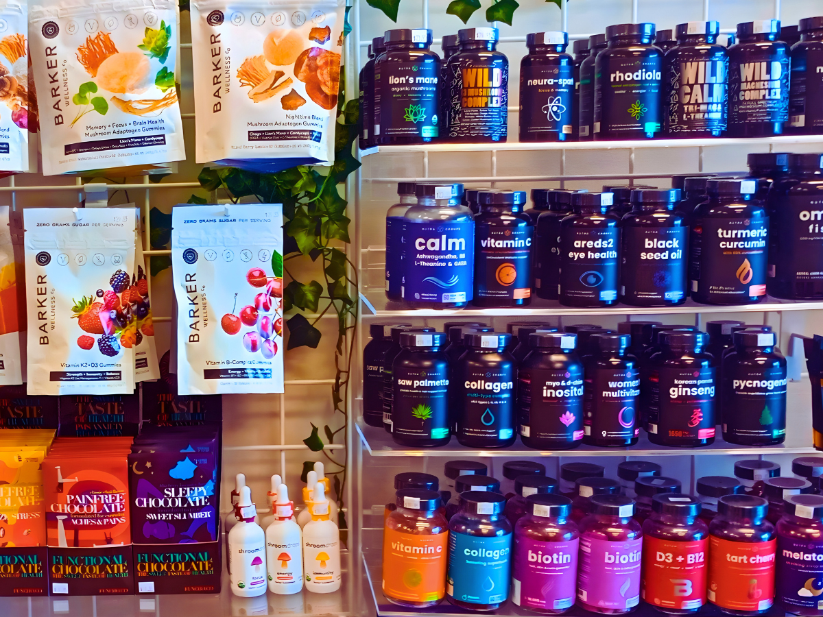 We carry magnesium supplements in capsules, powder, lotions, and topicals, adaptogens like ashwagandha and rhodiola, essential vitamins including Vitamin D, Vitamin C, and B-Complex, joint support with glucosamine and turmeric, energy supplements, sleep support including melatonin, and complete wellness products.